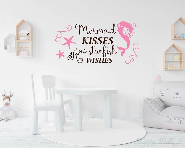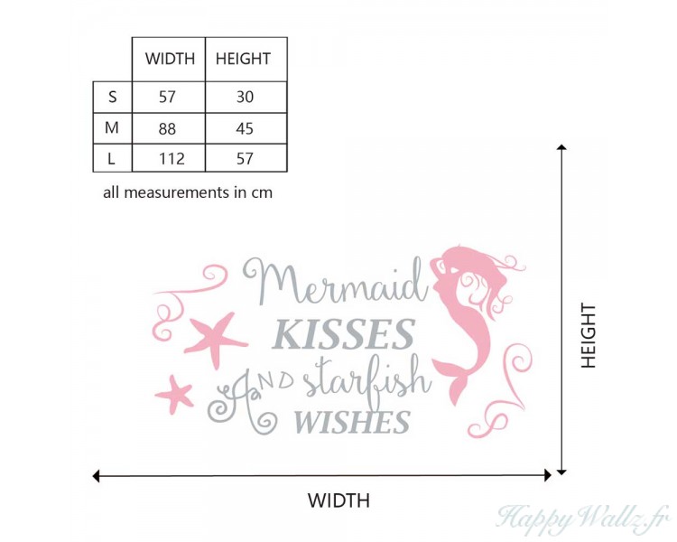 Ce sticker mural Mermaid Kisses And Starfish Wishes est fait de vinyl d'intérieur mat de la plus haute qualité, pour vous donner l'effet de trois couches de peinture sans le temps et l'effort.