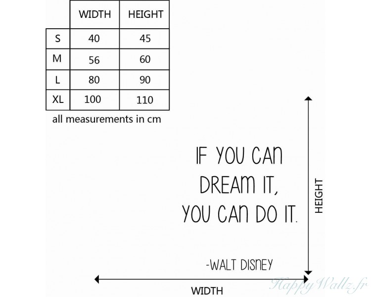 | Ce sticker mural représente une citation : "If you can dream it, you can do it. -- Walt Disney" En Français : « Si tu peux en rêver, tu peux le faire. – Walt Disney » Il sera idéal pour apporter une touche innovante à votre chambre, votre salon ou votre bureau. |