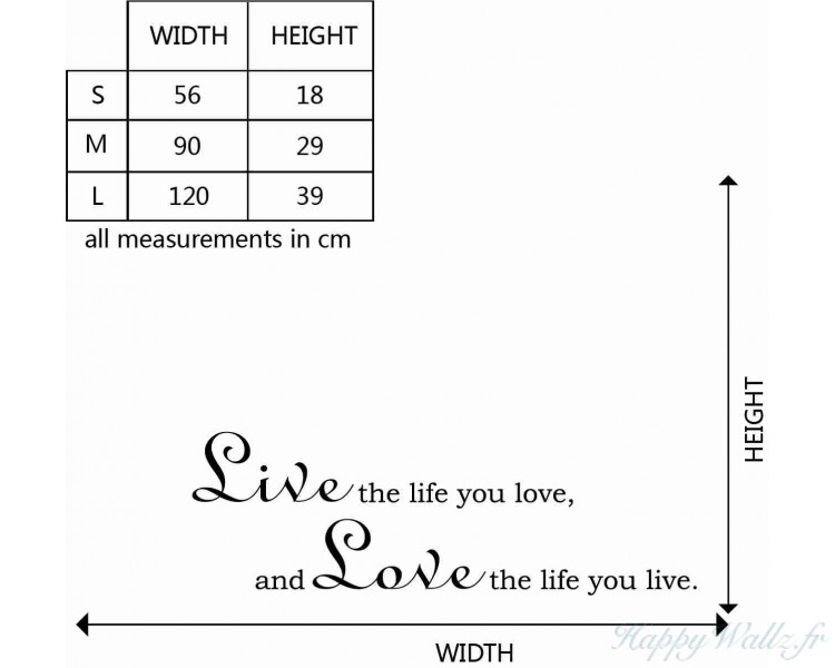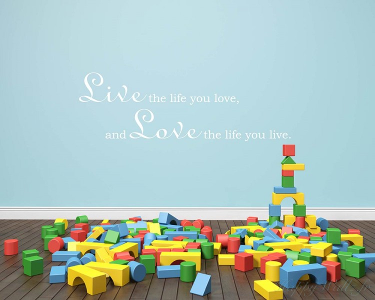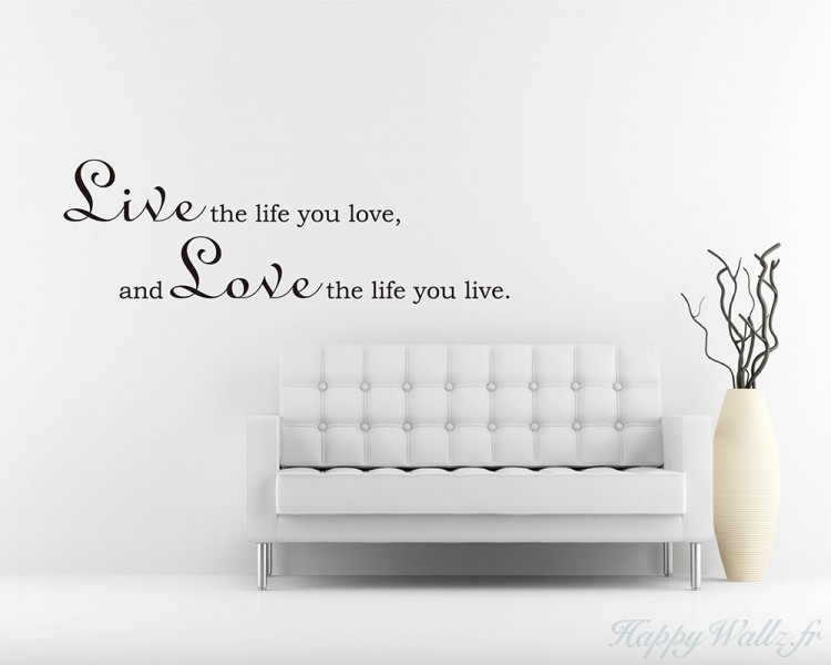 | Ce sticker mural représente une citation : "Live the life you love, and love the life you live." En Français : « Vis la vie que tu aimes, et aime la vie que tu vis. » Il sera idéal pour apporter une touche innovante à votre chambre, votre salon ou votre bureau. |