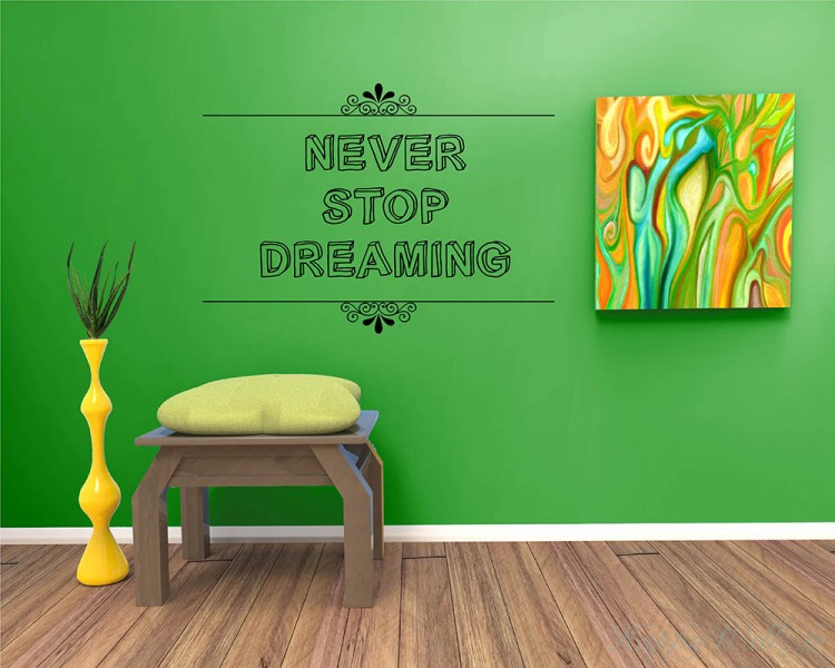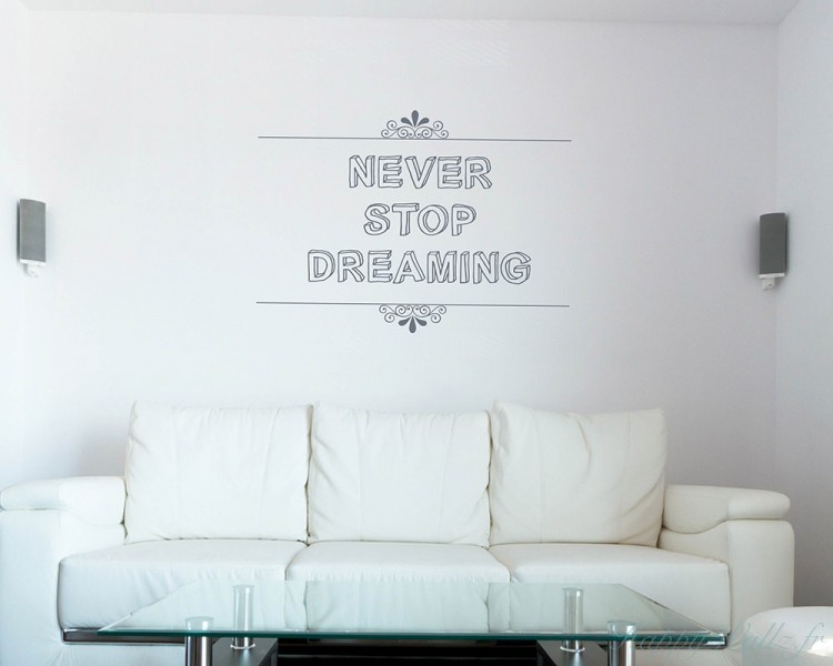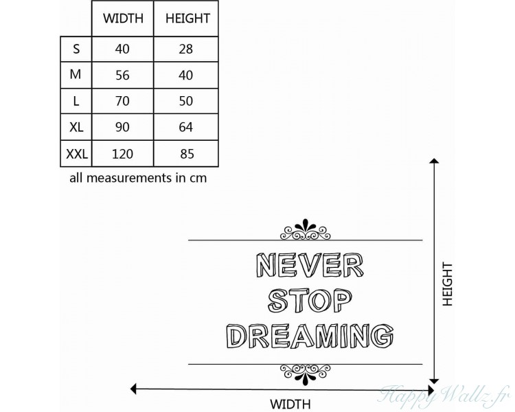 | Ce sticker mural représente une citation : "Never stop dreaming." En Français : « N'arrête jamais de rêver. » Il sera idéal pour apporter une touche innovante à votre chambre, votre salon ou votre bureau. |