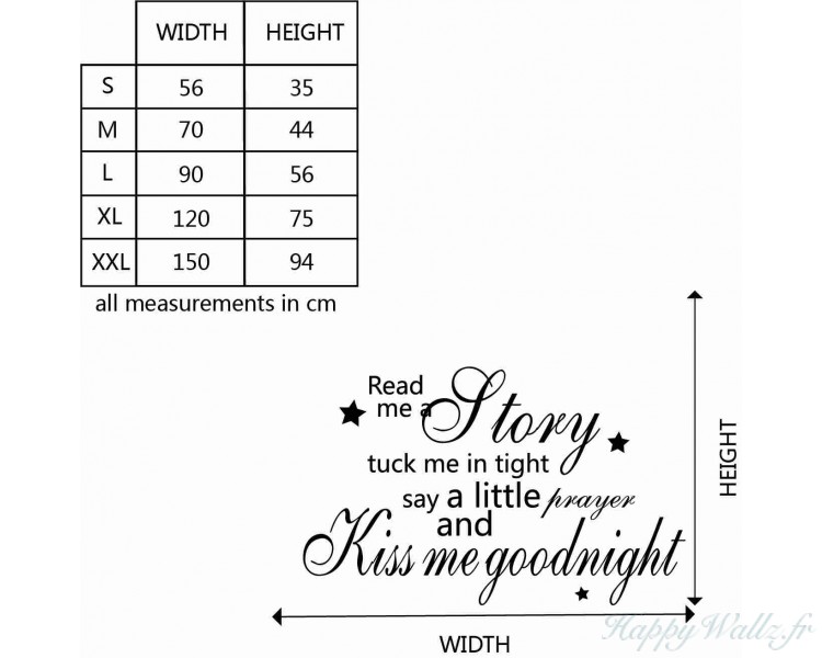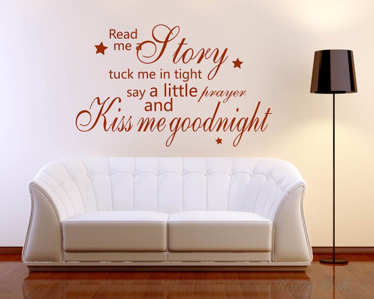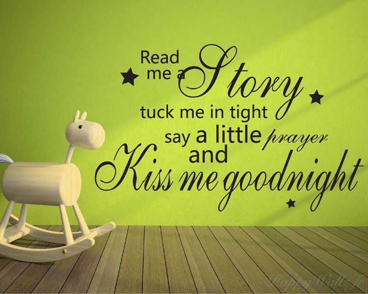 | Ce sticker mural est une sorte de devise avec la citation : "Read me a story, tuck me in tight, say a little prayer, and kiss me goodnight." Vous pouvez avoir un tel sticker de citation dans votre salon, dans votre chambre, dans votre salon ainsi que dans votre bureau. L'application d'un tel fantastique sticker citation dans votre chambre donnera un style innovant. |