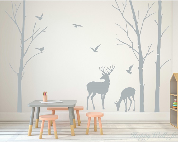 Cette forêt de bouleaux avec une biche et un cerf sera le décor parfait pour votre nursery sur le thème de la nature, n'est-ce pas ? Illuminez votre intérieur avec ce sticker mural plein de vie.