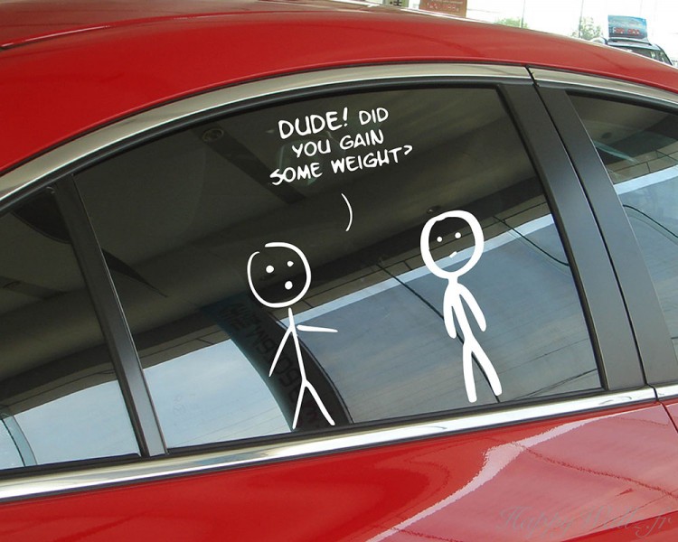 Ce sticker mural représente deux personnages dont l'un dit : Dude! Did you gain some weight? En Français : "Mec ! T'as pris du poids ?"