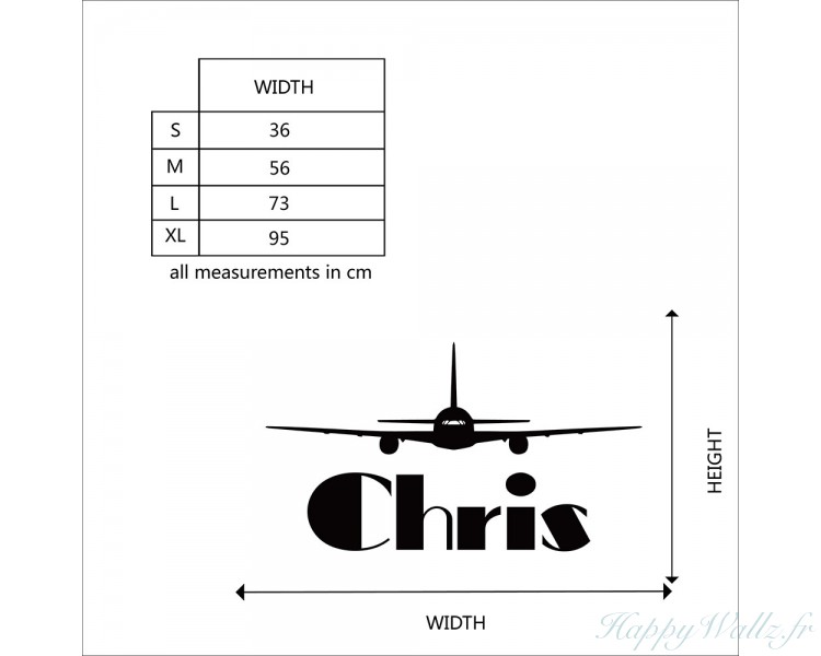 Ce sticker mural représente votre nom personnalisé ainsi qu'un avion.