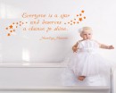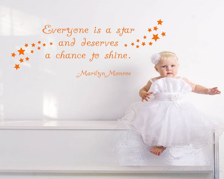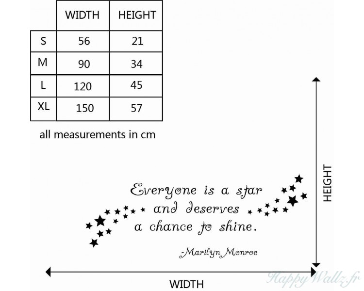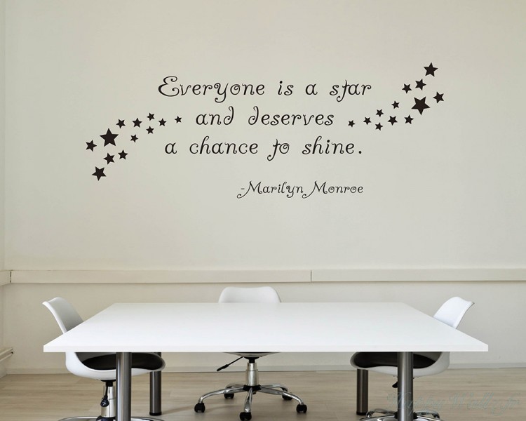 | Ce sticker mural représente une citation : "Everyone is a star and deserves a chance to shine. -- Marilyn Monroe." En Français : « Tout le monde est une étoile et mérite une chance de briller. – Marilyn Monroe » Il sera idéal pour apporter une touche innovante à votre chambre, votre salon ou votre bureau. |