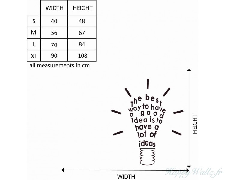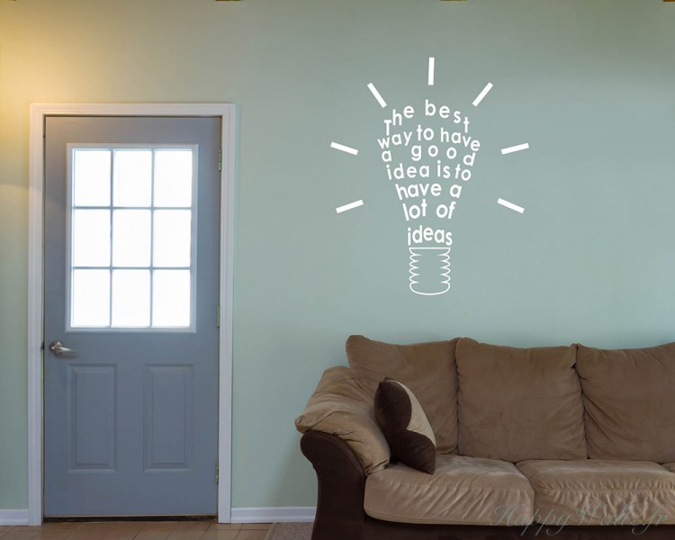 | Ce sticker mural représente une citation : "The best way to have a good idea is to have a lot of ideas." En Français : « Le meilleur moyen d'avoir une bonne idée, c'est d'en avoir beaucoup. » Il sera idéal pour apporter une touche innovante à votre chambre, votre salon ou votre bureau. |